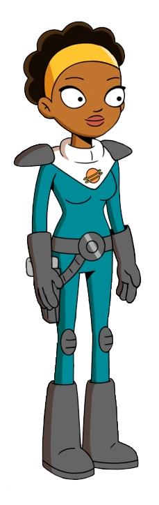 Quinn has dark brown hair and brown skin, and is of African descent. She wears a blue spacesuit with the Infinity Guard's double-ringed Jupiter logo.